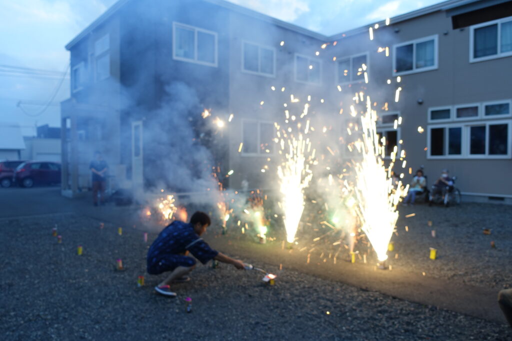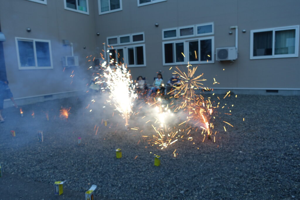 夏だ!!花火だ!!By teiai / 2023年7月30日 タコの花火✨面白いね~☺ 花火の前にシャボン玉で遊んだよ♪ 7月28日(金)まごころでは初めての試み「花火大会」を開催しました!「花火なんて何年ぶりだろうぉ~」「娘が小さい時だから50年前か!?」等とお話ししながら、パチパチ、キラキラと光り輝く手持ち花火を楽しみました♪フィナーレは噴射花火をはじめとする打ち上げ花火も用意し、夕方の少し涼しくなった(といっても28℃くらい気温がありました💦)北見の夏を堪能しました。久しぶりの外でのイベントでしたので、皆さん最後まで楽しんでくれていた様でした(*’ω’*)
